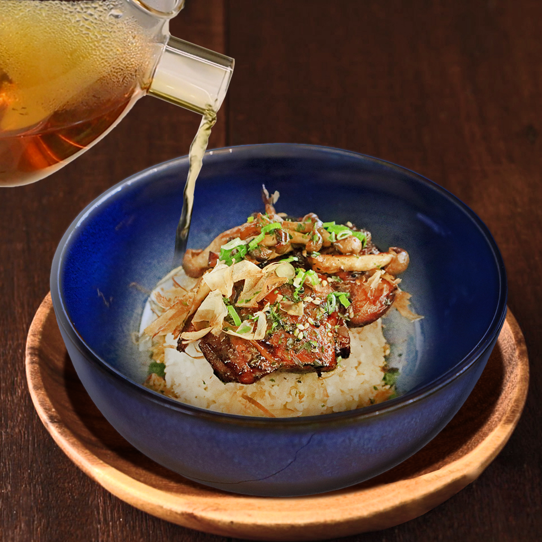 Da Hong Pao tea is poured over steamed rice, blending with delicate toppings for a warm, umami-rich harmony.