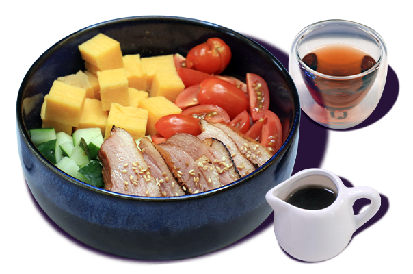Smoked duck, Cherry tomato, Japanese cucumber, Tamago and Furikake seasoning.