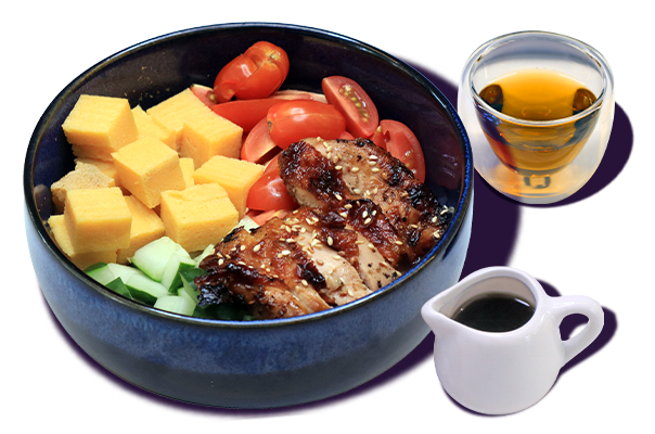 Teriyaki chicken, Cherry tomato, Japanese cucumber, Tamago and Furikake seasoning.